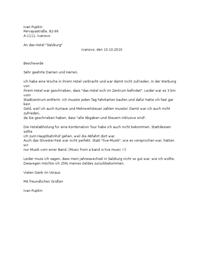 Ein Beschwerdebrief über Den Sprachkurs Brief Schreiben Zur