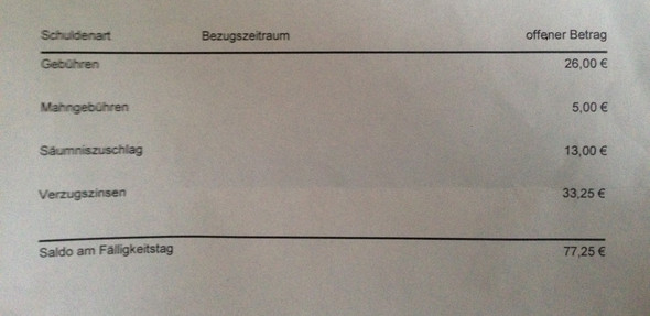 Vollstreckungsauftrag an die gerichtsvollzieherinden gerichtsvollzieher zur vollstreckung von geldforderungen in der zwangsvollstreckungssache. Letzte woche habe ich dann direkt einen festsetzungsbescheid für die monate märz bis mai erhalten. Werdenmehrere zahlungsaufforderungen gleichzeitig und gleichlautend anmehrere schuldner versandt fällt in jedem einzelfall diegebühr an. Es muß ein richtiger verwaltungsakt sein.