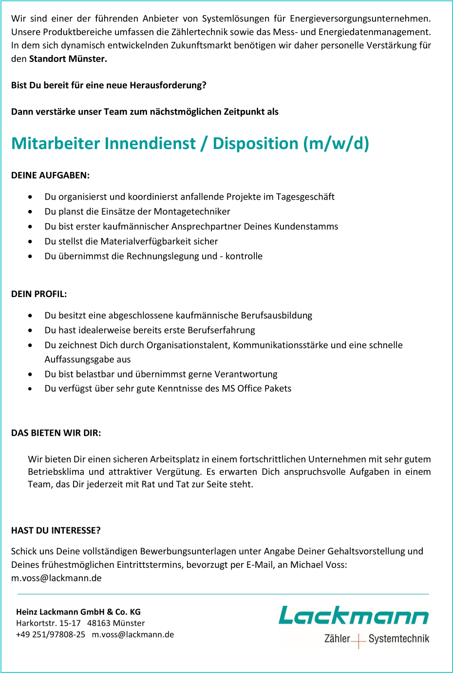 Mitarbeiter Innendienstdisposition Mwd In Münster Heinz