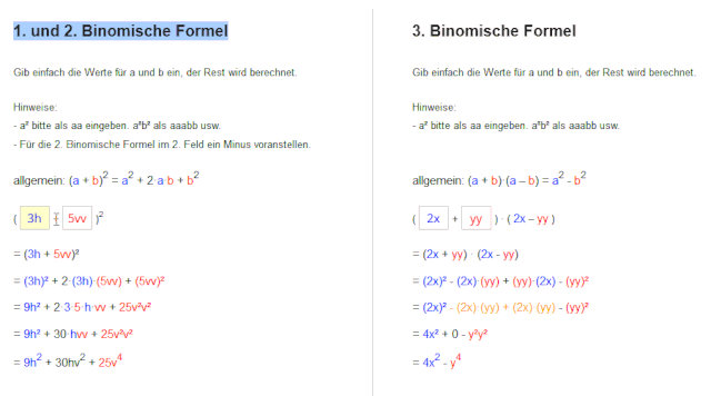 Beginnen wir damit die 1. Gib einfach die werte für a und b ein der rest wird berechnet. Und zwar wie man die binomischen formeln vorwärts und rückwärts anwendet. Die binomischen formeln sind drei formeln zum ausmultiplizieren von produkten mit zwei verschiedenen variablen.