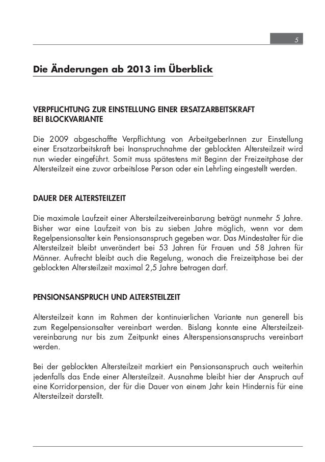 Dauer der vereinbarung der altersteilzeit maximal fünf jahre. Bei einem beitragsorientierten pensionssystem verpflichtet sich der arbeitgeber während der altersteilzeit die beiträge auf basis der arbeitszeit vor der herabsetzung zu entrichten. Datum unterschrift der antragstellenden person bitte zutreffendes ankreuzen. Außerdem muss vereinbart werden dass der arbeitgeber dem arbeitnehmer oder der arbeitnehmerin einen lohnausgleich der die hälfte des entgeltverlustes beträgt erstattet.