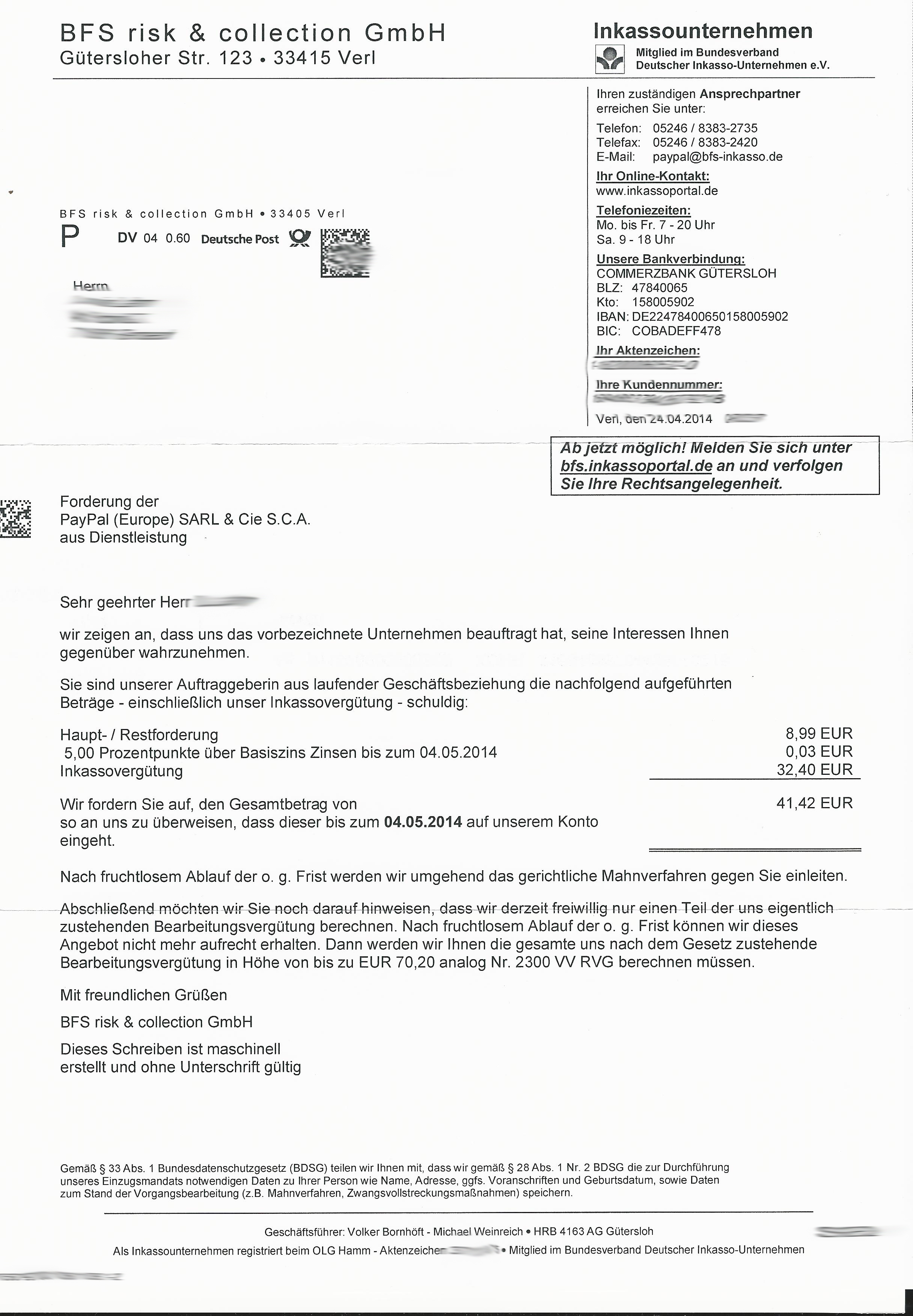 Bekam ich eine mail von paypal die mich daran erinnern sollte dass ich ein negatives paypalkonto habe. Ich habe vor längerer zeit eine e mail der im titel genannten inkassogesellschaft erhalten und bin mir der ausstehenden zahlungen die gefordert werden bewusst jedoch tun sich mir neben der bereits falsch gestellten mahngebühren des mandanten der tesch weitere zweifel an den inkassogebühren auf. Bitte beachten sie dass ihre e mail adresse nur einmal im inkassoportal vergeben werden kann. Bitte achten sie auf den absender der e mail.