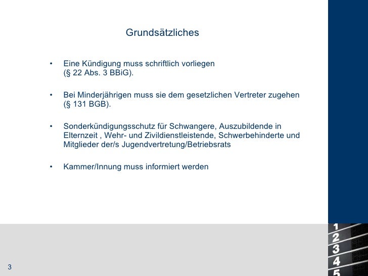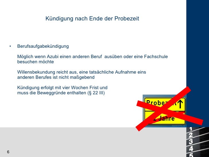 Der betrieb möchte den personalbestand reduzieren. Kündigung nach der probezeit während des ausbildungsverhältnisses durch den azubi auch der auszubilende kann aus wichtigem grund ohne einhaltung einer kündigungsfrist schriftlich kündigen. Kündigung nach der probezeit kündigung nur aus einem wichtigen grund nach ablauf der probezeit kann ein ausbildungsverhältnis nur aus einem wichtigen grund ohne einhalten einer kündigungsfrist gekündigt werden. Kürzere oder längere probezeitvereinbarungen sind unwirksam.